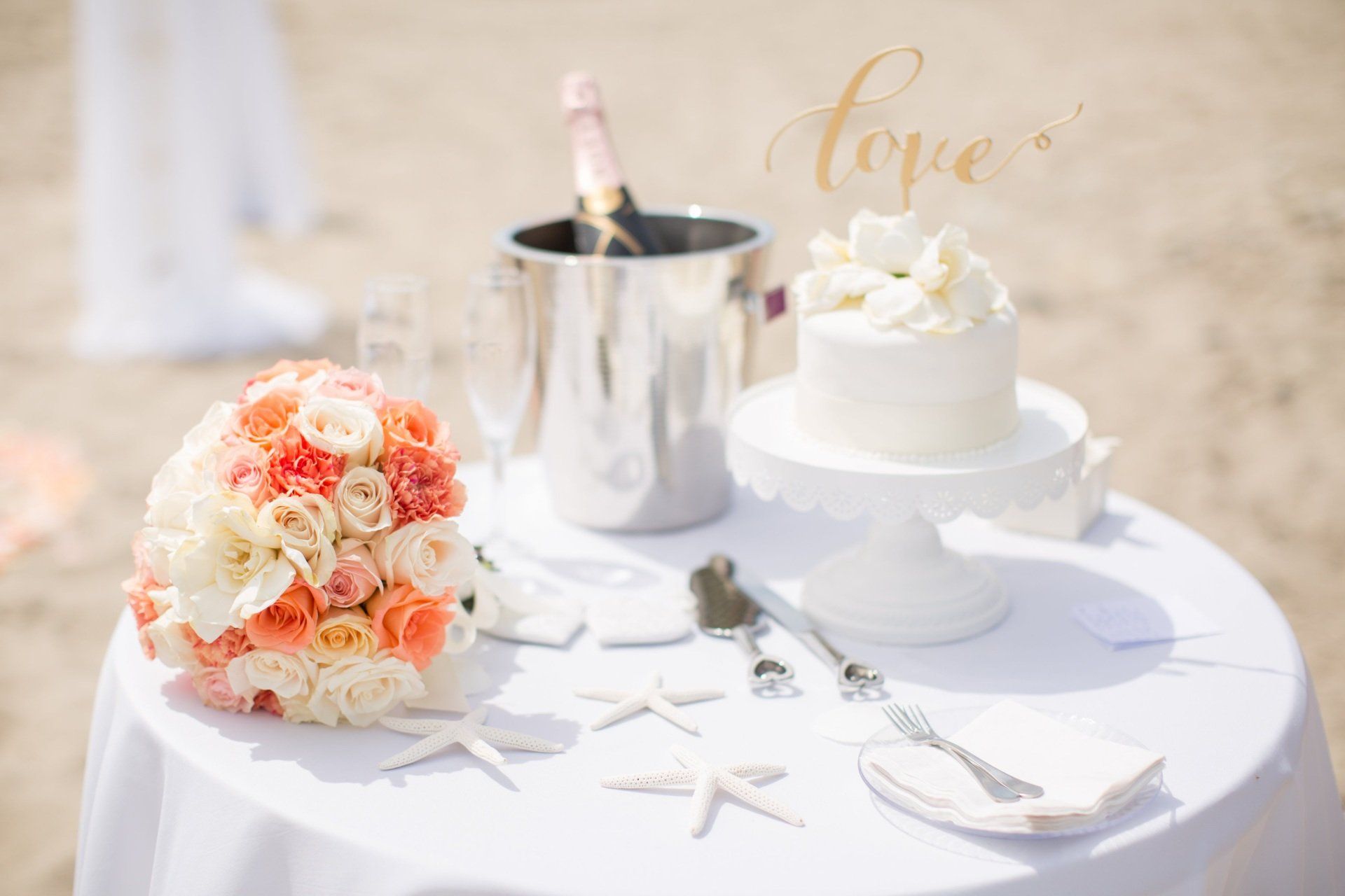Zum Set up Design gehören natürlich ein auf die Farben abgestimmt festlich dekorierter Sekt Tisch. Die Unity Sand und Sand Dollar Ceremony sind ebenfalls Bestandteil des "JUST the TWO of YOU". Hochzeitpakets.