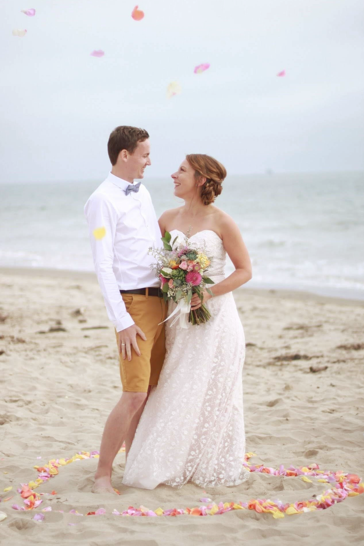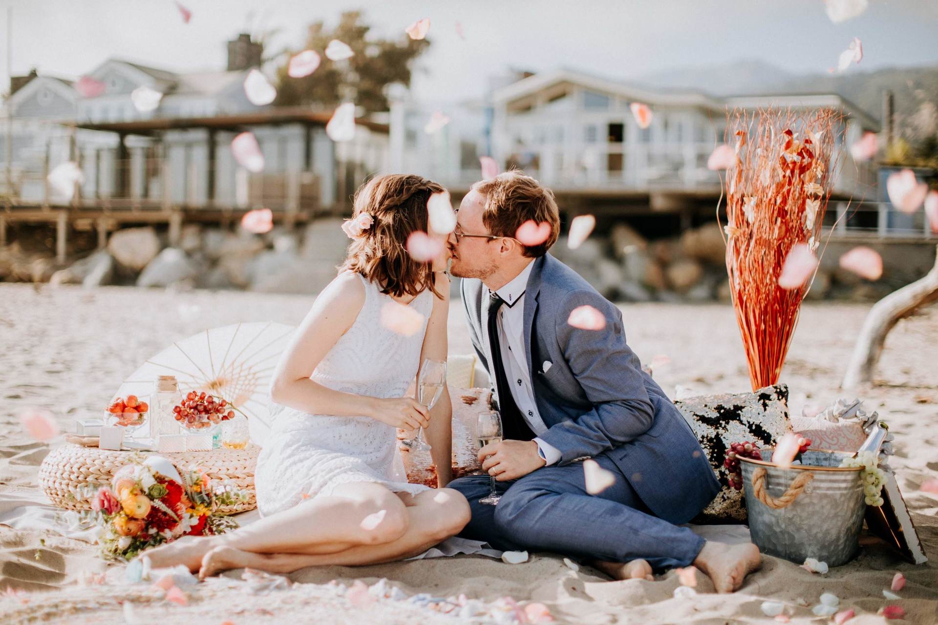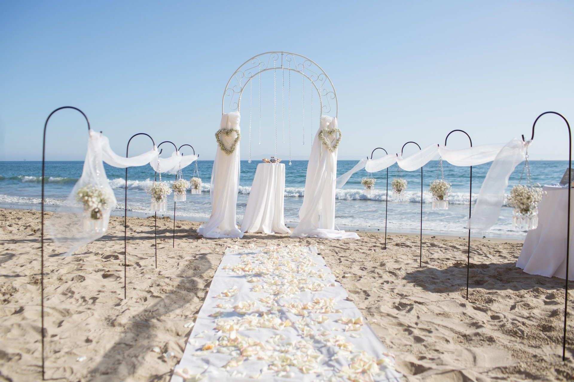 02 Das "JUST the TWO of You" Design besteht aus einem wunderschönen, in den warmen Sand gezeichnetes großes Herz. Gefüllt mit vielen, dicken, frischen Rosenblättern, in den Farben Ihrer Wahl. Motiv und Design werden dem Anlass einer schlichten doch romantischen Strandhochzeit mehr als gerecht. Es ist unser preisgünstigestes Set up, und schmeichelt damit jedem Budget. Der Wunsch nach einer Rundum -Sorglos -TraumHochzeit am Strand in CA lässt sich mit uns sehr leicht erfüllen. Während der Trauung steht unser Brautpaar in seinem BlütenHERZ, das auch für das Fotoshooting ein bezauberndes Hintergrundmotiv liefert.