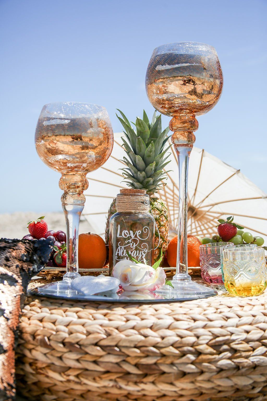 Zum Set up Design gehören natürlich ein auf die Farben abgestimmt festlich dekorierter Sekt Tisch. Die Unity Sand und Sand Dollar Ceremony sind ebenfalls Bestandteil des "JUST the TWO of YOU". Hochzeitpakets.